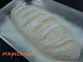 o forno deverá estar pré aquecido, assar até ficar corado, você poderá ao invés de colocar farinha, borrifar agua no pão e no forno ou até mesmo manter uma assadeira pequena com agua fervente para causar vapor e dar crocância a crosta do pão.