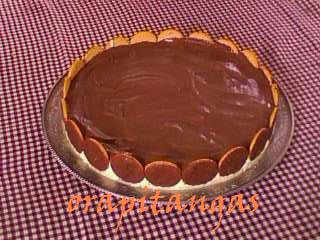fundo: montar na forma de fundo falso, forrada com papel manteiga, bolacha maria molhadas no leito e no licor de cacau ou outro de sua preferência. na lateral usar bolachas com cobertura de chocolate. reservar.